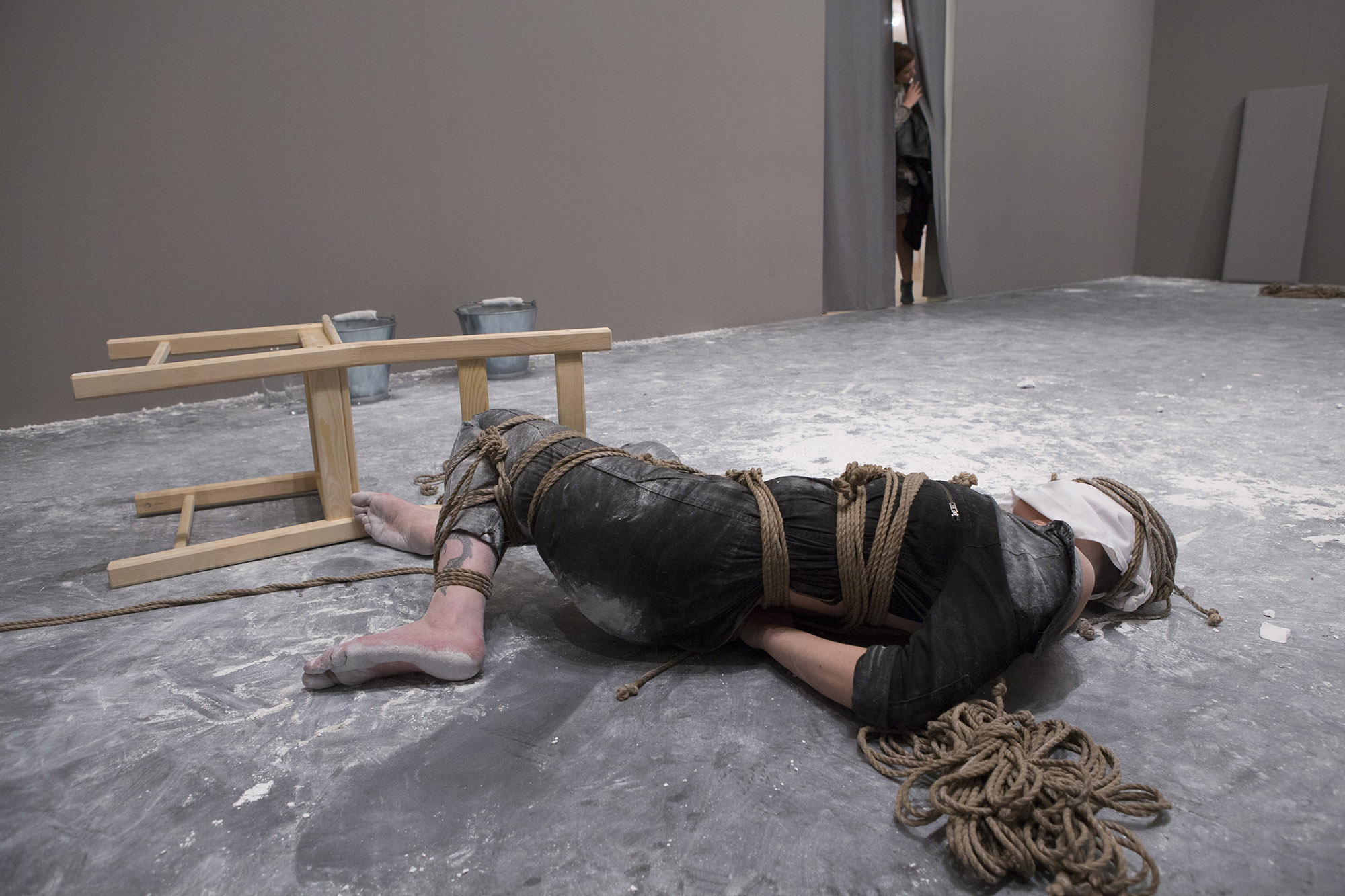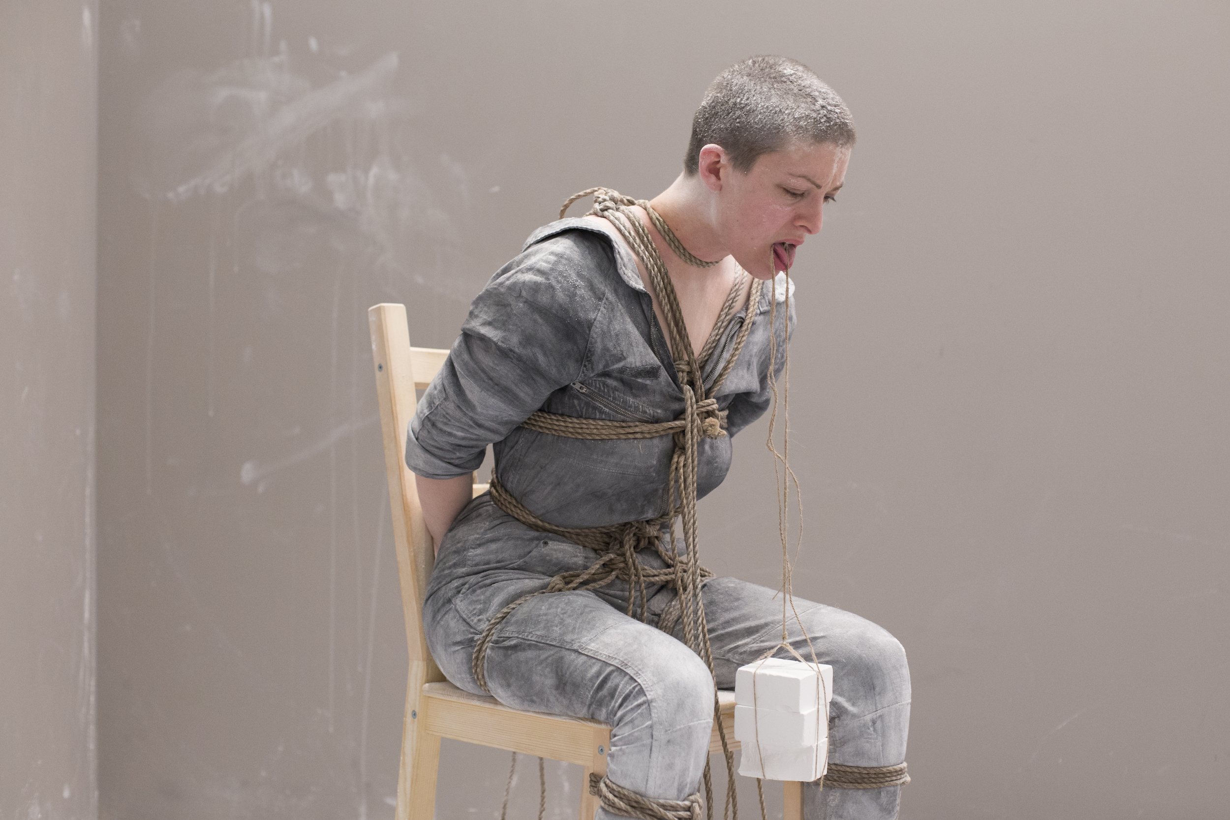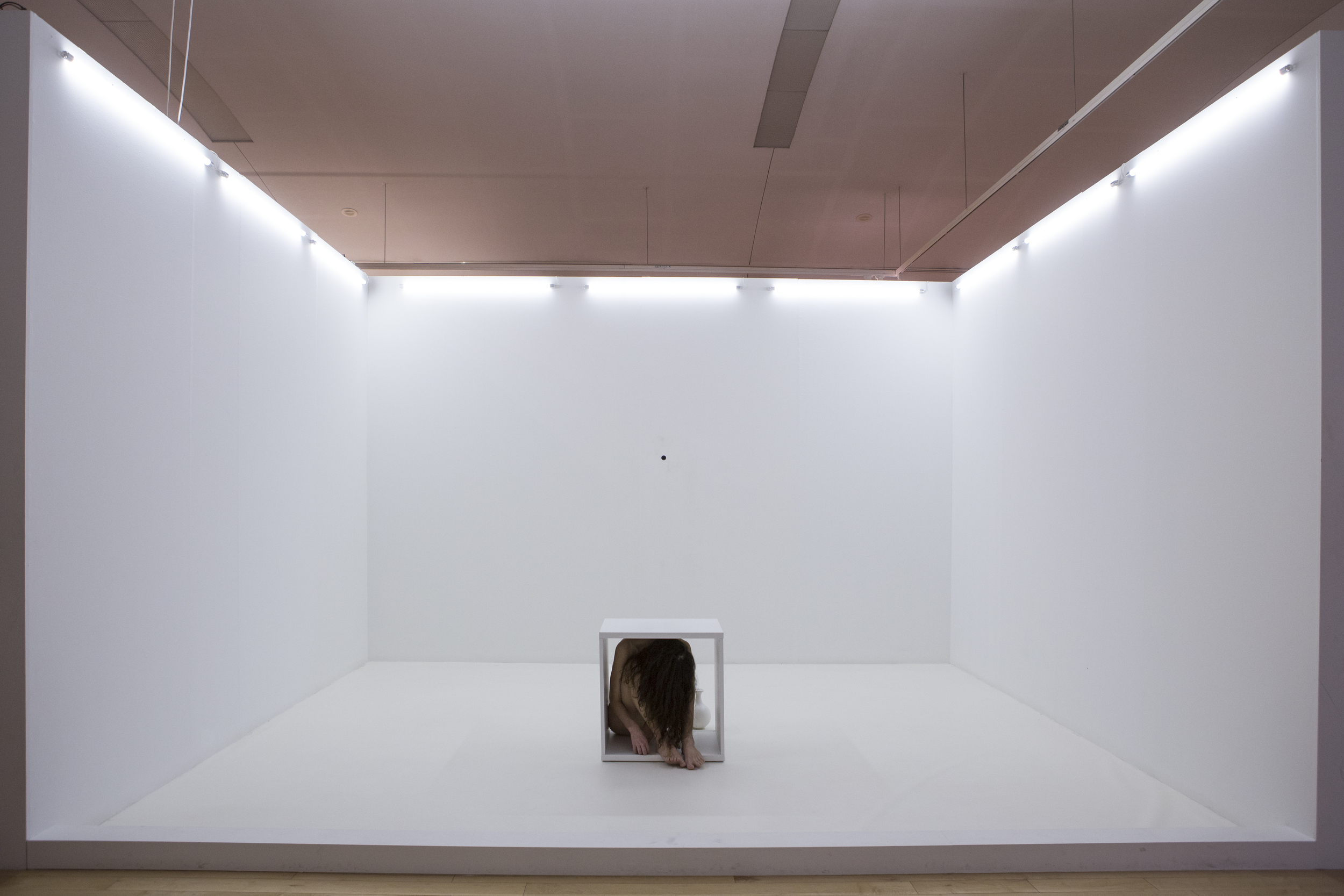 This performance explores the mental spaces that open up during control exchange in human relationships. Over the course of seven weeks, for eight hours per day, the artist will “host” the audience in an enclosed space and perform a set of actions combining methods and goals drawn from practices of meditation, discipline and restriction. The goal of this piece is to create potent, experimental situations of control exchange while playing with the multiple functions of the gaze: a mechanism for introspection, surveillance, recognition and communication.