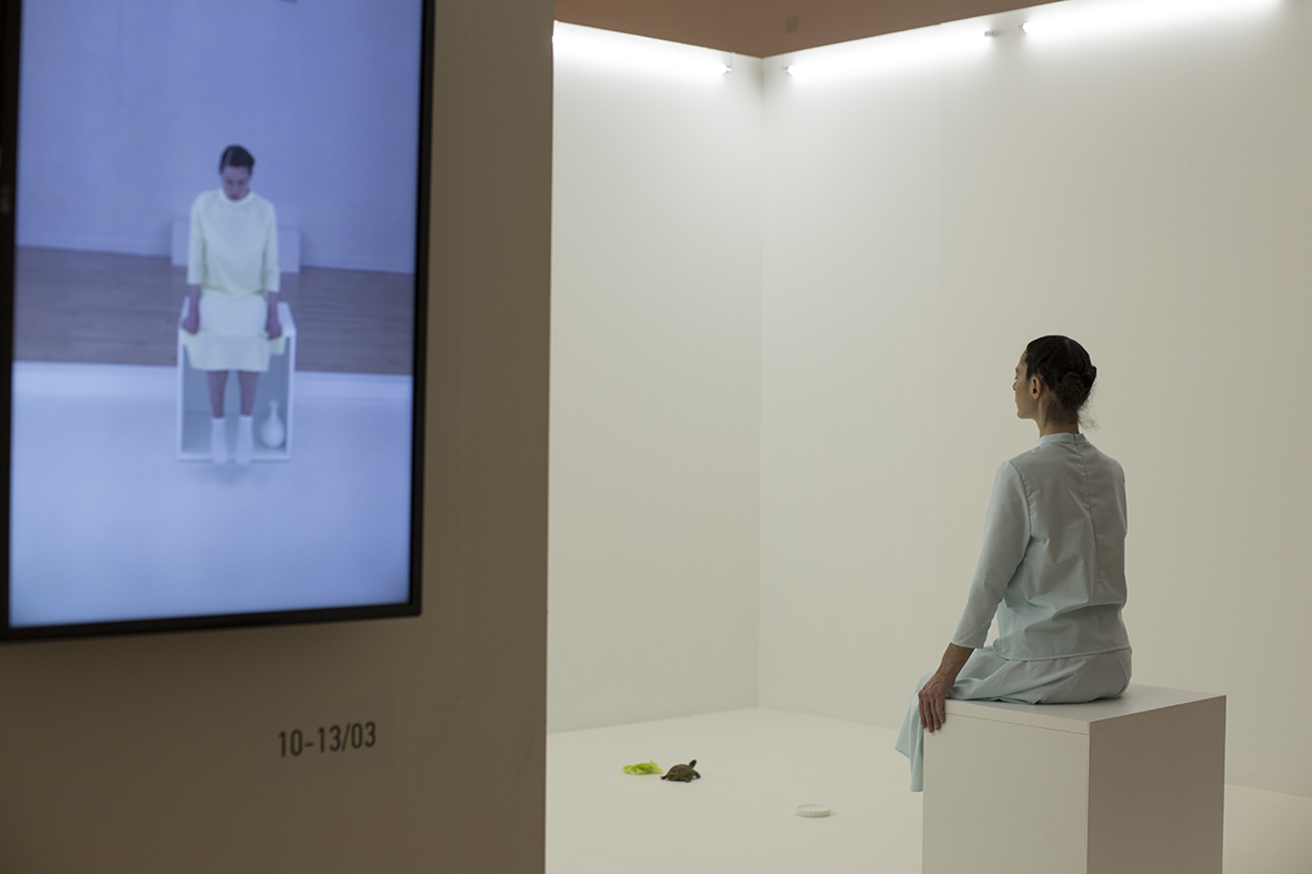 In this allegory of Plato’s Cave, Nancy Stamatopoulou directs her own “spiritual confinement” within a reality composed of everyday objects. For eight hours each day over the course of seven weeks, the artist will remain within the narrow limits set by the sights of a camera lens, confined inside her own personal “cave” and the shadowy re-enactment of a personal truth. Time passes slowly, like the movement of a turtle. Actions are repetitious, like a punishment. Reality feels remote, the possibility of escape imperceptible.