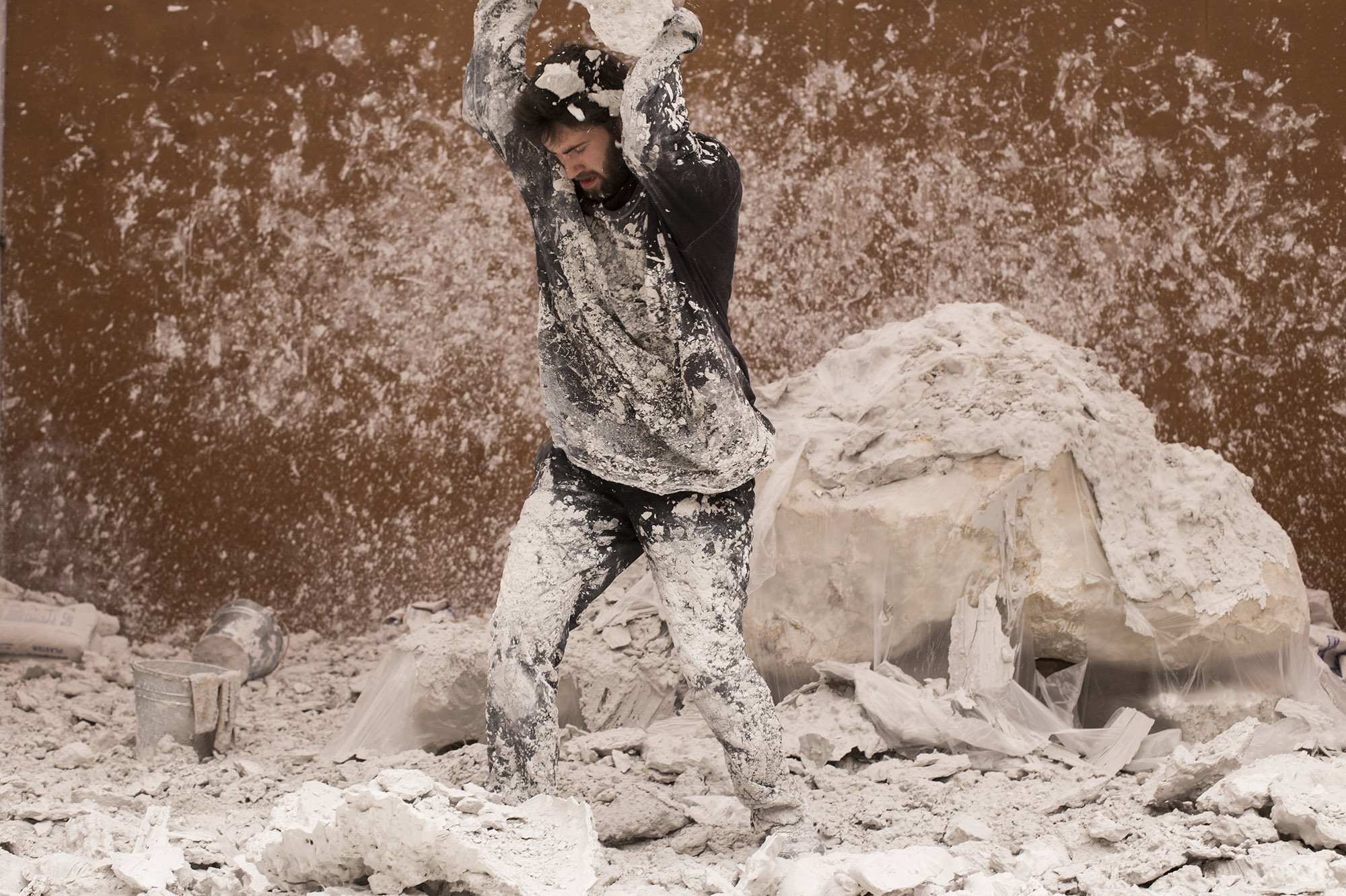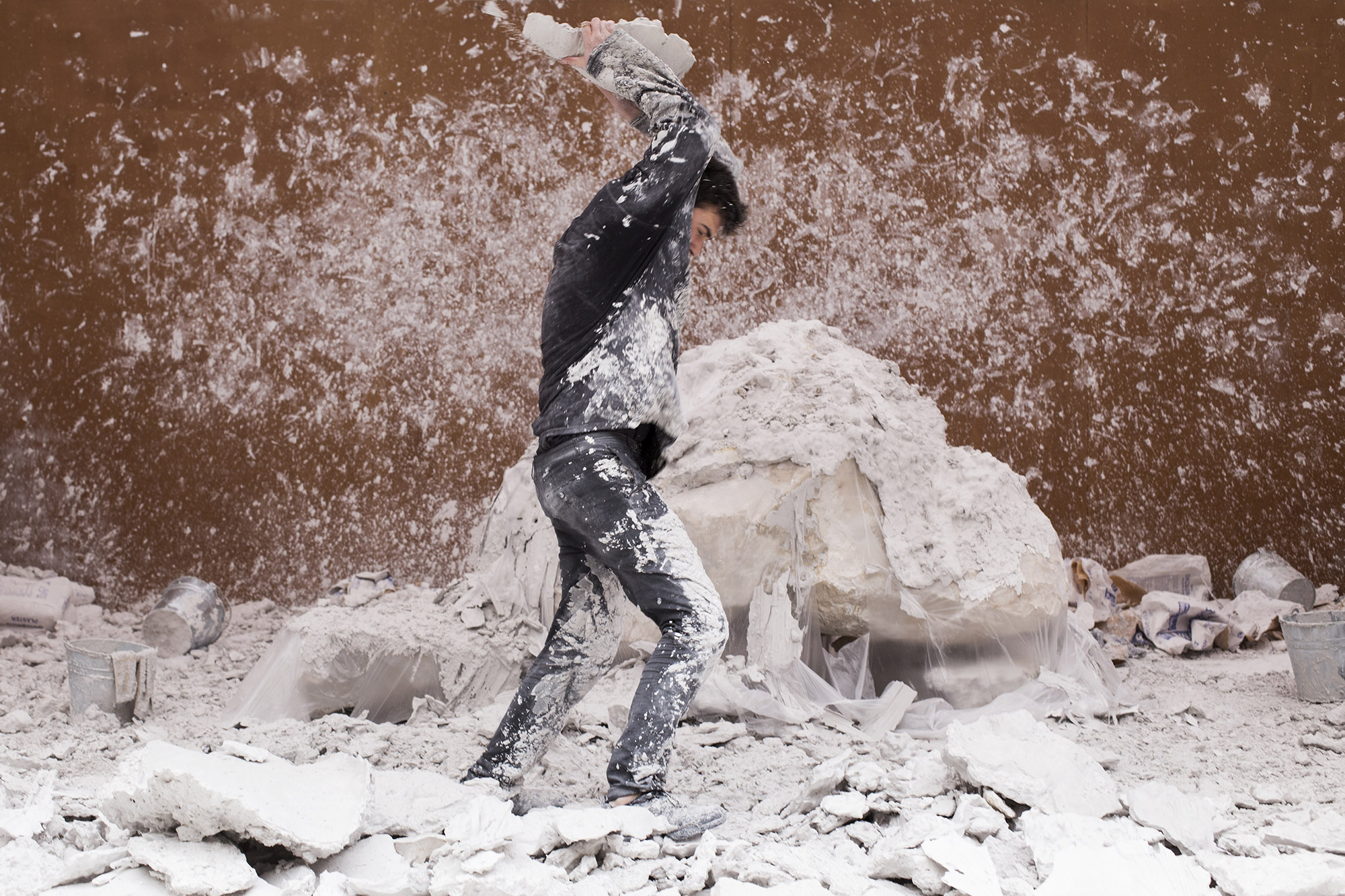 Nature and creation, division and composition. Thodoris Trampas delineates a process of union through destruction, and the need for reconciliation with the other side. In an enclosed space, six metres by seven, for seven weeks and eight hours each day, the body is set against the material world — a large piece of rock — in order to create its replica in plaster. This copying, this repetition, is a way of experiencing the existence of nature from scratch. Smashing the rock differentiates the copy from the original, and the resulting fragments accumulate and change the mass of the material — transform it, give it new form.